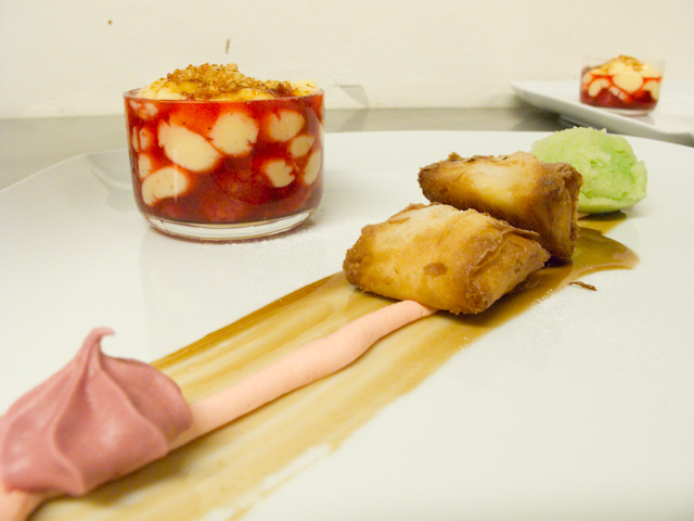 A sobremesa ainda me pareceu mais complicada, tal era quantidade de "adereços". Fazer a calda de champanhe para os morangos, fritar os pastelinhos. Pelo que vi, a grande dificuldade desta etapa foi espremer um saco de pasteleiro, mais ainda conseguir fazer uma linha contínua de creme. Parecia que tudo ia correr mal, mas depois de terminado o empratamento, os defeitos deixaram de se ver.